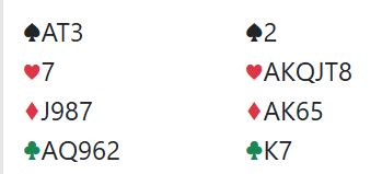 Ett trumfstikk til N/S ble alt de fikk, Norge +1430. Ved det andre bordet spilte Finland utgang så spillet ga 13 IMP til Norge. Litt heldig kanskje, men spilles det god bridge er man ofte heldig og!