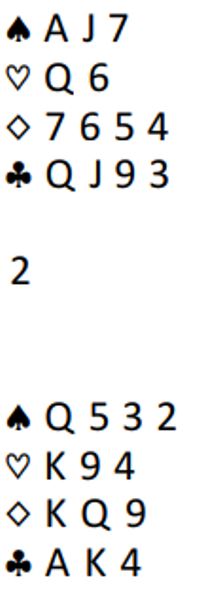 Så du legger liten hjerter fra begge hender i første stikk, kommer inn i tredje stikk etter hjerter ess og en til fra vest. Da spilles spar til knekten og østs konge. Derfra kommer kløver til esset. Så spar til nord og ruter opp mot syds honnører. Øst legger vel liten ruter, og damen vinner det stikket. De tre kløverstikkene tas og en spar forsvinner fra syd. Så mer ruter mot syd. Det vinnes i alt to sparstikk, ett hjerterstikk, to ruterstikk og fire kløverstikk = 9.
