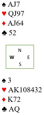 Med alle i sonen og syd som giver åpnet syd med 1 hjerter før vest hoppet inn med 2 spar (svakt innhopp). Nord meldte 3 spar som var definert som en god 4 hjertermelding. Det endte i 6 hjerter. Omtrent sånn gikk meldingene ved mange bord. Mange par kom altså i 6 hjerter, men spilleføringen gikk på ingen måte likt rundt omkring i salen.