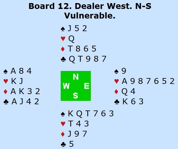 Vest var spillefører i 6NT og fikk hjerter knekt ut ved de fleste bordene. Det er seks sikre stikk i majorfargene, to ruterstikk og to kløverstikk = 10. Men flere muligheter for ekstra stikk. Om hjerteren sitter 3-3 er det elleve stikk, og om sparen også sitter fordelt 3-3 eller en av dem har J-10 dobbel i spar er det tretten enkle. Men hva om ingen av de fargene gir ekstra stikk?
