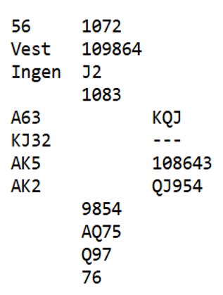 Med alle i sonen og syd som giver åpnet syd med 1 hjerter før vest hoppet inn med 2 spar (svakt innhopp). Nord meldte 3 spar som var definert som en god 4 hjertermelding. Det endte i 6 hjerter. Omtrent sånn gikk meldingene ved mange bord. Mange par kom altså i 6 hjerter, men spilleføringen gikk på ingen måte likt rundt omkring i salen.
