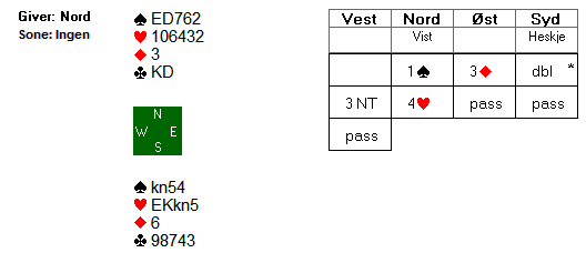 Boye Brogeland var for øvrig i 7 NT på samme spillet etter at motparten hadde vært med og sperret i hjerter. I den kontrakten har man sjansen til å teste ruteren før man tar hjerterfinessen, rett og slett fordi man ikke trenger å bekymre seg for stjelinger i mot når man spiller grandkontrakt.