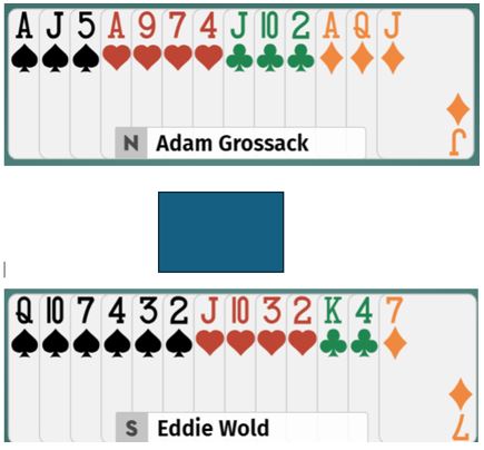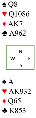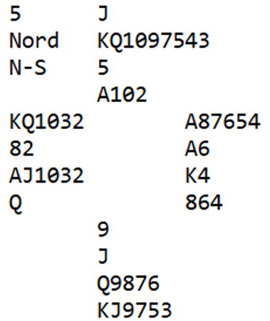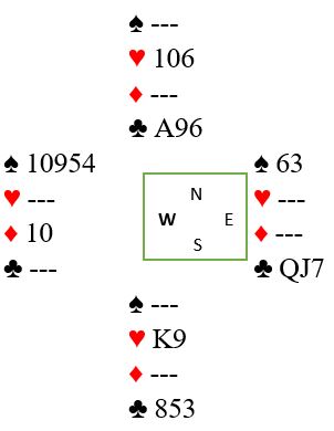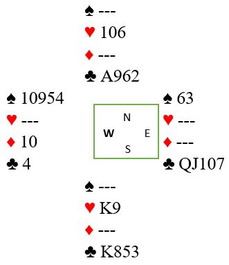 Uforståelig nok, vest spilte ut ruter 7 (norsk fordeling) ved det bordet også. Det gikk ruter 9, 10 og konge fulgt av spar ess og mer spar til vests konge. Det kom nok en ruter (!) til esset. Rutersitsen var nå på det nærmeste klar uten at det hjelper noe, det ser uansett ut til å være fire uungåelige tapere. Vest må ha rutersyveren dobbel, for om han hadde startet med fire ruter ville utspillskortet - syveren - vært det nest høyeste kortet. Inne på ruter ess ble kløver 10 spilt til vests ess. Han spilte mer kløver til østs konge. Ingen ting som koster noe har egentlig skjedd så langt, og de vil fortsatt få ett hjerterstikk mot slutten - betestikket - ikke sant?