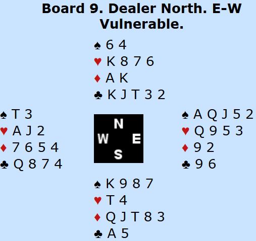 Dette er en hardmeldt, men ganske normal 3NT N/S som greit vinnes i praksis. Ved de fire bordene (finalen og kampen om 3.plassen) var kontrakten 3NT ved to av dem (+400) og ved ett bord spilte N/S 2NT med åtte stikk.