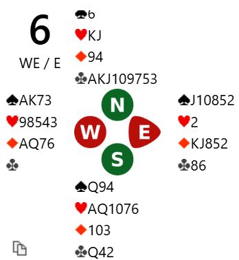 Ø/V har 25 HP til sammen og balanserte hender. Det er normalt å ende i 3NT, men slikt det sitter er det i praksis nokså umulig å vinne den. Om ruteren treffes er man et stykke på vei, men det ser likevel ut som det er langt frem til ni stikk. Alle som bruker 15-17 grand kommer i 3NT hvis nord passer og øst åpner med 1NT. Men om de bruker 13-15NT går det an å si pass på 1NT med vests flate 10-poenger, vel vitende at det er 23 eller 24 poeng til sammen de fleste gangene, kanskje 25 noen ganger,
