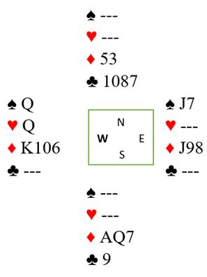 Det er en alternativ spilleføring, en god variant hvor kontrakten vinnes også om vest har dame-knekt tredje i hjerter, eller minst firekorts hjerter uten at en må prøve den litt skumle planen liten til tieren. Etter to runder trumf tas to store hjertere med det samme. Så A-K i spar med hjerteravkast (!) fulgt av en spar til stjeling som eliminerer den fargen. Så spilles en tredje runde hjerter idet nord og syd har 1-1 gjenværende i fargen. Hvis vest kommer inn som han gjør her ser det slik ut: