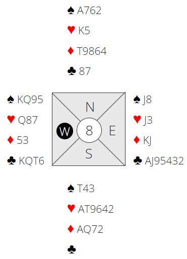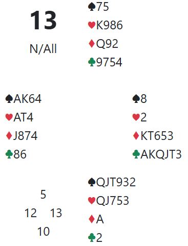 //At det faktisk står tretten stikk i ruterkontrakt bør ikke N/S bekymre seg særlig mye over om de kommer seg i 4 hjerter som i så fall vil gi en veldig god score. De blir neppe mange N/S-par som kommer i utgang med disse kortene.//