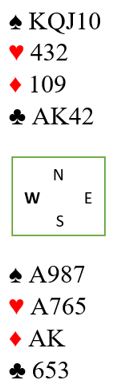 Det er ni toppstikk, 4+1+2+2 = 9. Hvor skal det tiende komme fra? Vel, hvis trumfen sitter 3-2 blir det en stjeling på en av hendene senere, og da blir det fem trumfstikk totalt. Men da spillet forekom startet mange med trumfen. I andre trumfrunde kastet vest ruter 6, så øst startet altså med fire trumf. Hvis trumfen tas ut nå er det en sjanse at kløveren sitter 3-3. Da kan ett ekstra stikk godspilles i den fargen. En kan tenke på å få seg ett ekstra i hjerter hvis den fargen sitter 3-3. Men etter en sånn start begynte det å blir litt klønete. Det går dog an å kontre tilbake til det man burde tenkt på i starten for å få det til fortsatt. For dette er et spill med en stjeleverdi! Det ser ikke ut som det er en stjeleverdi som er løsningen med 4-3 farger over alt, og i den fargen det er en dobbelton er det dobbelton på den andre siden også! Men joda, her kan man greit sikre seg et stjelestikk på den ene siden og beholde fire trumf på den andre, totalt fem trumfstikk.