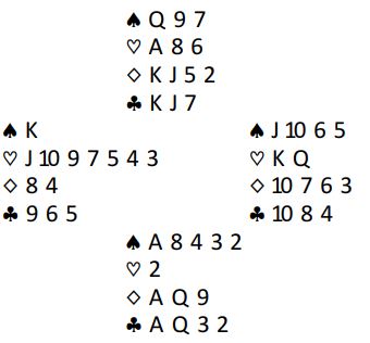 Ingen gikk bet i 3NT, selv om det flere steder kom hjerter 3 i utspill fra nord til syds konge, og liten hjerter tilbake. Hva ville du gjort i den situasjonen?