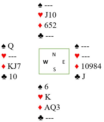 Løsning: Etter to runder trumf, spill ruter knekt som trumfes hos nord. Ett sparstikk må tapes uansett, så gi bort det stikket med liten fra begge hender. En av dem kommer inn og spiller spar tilbake til esset. Så trumfes den tredje sparen. Her er resten av kortene om det fra start sitter sånn som i vårt fullstendige diagram: