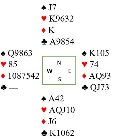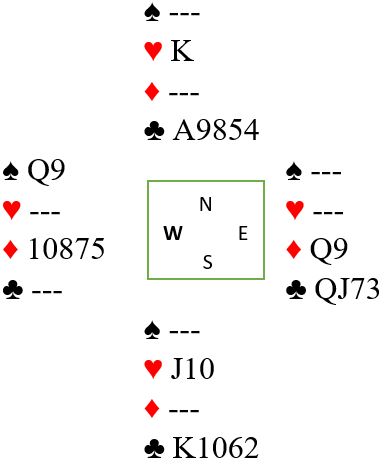 Hvis kløver ess spilles blir det selvsagt ingen problemer. Men vest kan også være den som har firekorts kløver. Med denne sitsen kan det bli to kløvertapere om kongen spilles først. Og om kløver ess spilles tidlig får vest to kløverstikk om esset spilles først.