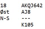 Kun seks av 30 lag fant frem til 6 hjerter som er en glimrende slem. Motparten har kun ett kløverstikk. Om det ikke kommer kløver ut er det bare å ta ut trumfen, for selv om det skulle vise seg å være kun tre ruterstikk er det tolv sikre. I dette tilfellet blir det tretten stikk om ikke N/S får med seg kløverstikket. Noen få par stoppet i delkontrakt (!), og hvordan/hvorfor det skjedde ønsker jeg ikke gjette på. Resten var i utgang.