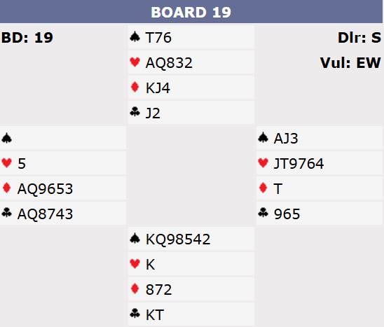 Makker fant beste utspill, han spilte ut hjerter konge som jeg stakk med esset og spilte kløver tilbake. Det kan jo være slik at spillefører som er markert med fem eller seks hjertere (utspillet er fra kongen singel eller dobbel) har kun 2-2 i minor, eller 1-2, og i så fall blir det minst ett ruterstikk senere ved å skifte til trumf. Men her ble det ikke flere stikk på oss. Spillefører trumfet to rutere og tok kjapt tolv stikk, ett doblet overstikk og +950 til Ø/V. Det ser litt ut som om 6 kløver faktisk står alltid, men -950 er uansett ikke særlig god score å ha på listen sin...