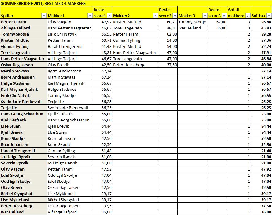 Under er resultatlisten. Den leses best slik: Navnene i første kollonne er spilleren som er rangert, så kommer kollonnene som viser hvem man har spilt med, den høyeste scoren man har med denne makkeren, hvor mange makkere man har hatt og til slutt snittscoren med de ulike makkere. Det er slik at vi kommer ikke til å "samle" på dårligere resultater du har med samme makker i denne oversikten. Her viser vi kun det beste.