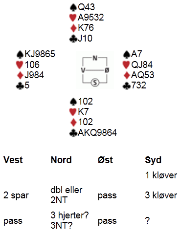 Dette spillet er fra sist tirsdag, og inneholder flere interessante poenger i både spill og meldinger. Given var som under, med et forslag til meldingsforløp: