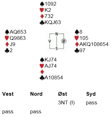 De ivrigste av oss (som undetegnede) bruker et kvarter eller to med bridge på internett i uka. Der dukket følgende spill opp en kveld, og øst tok like gjerne meldebunken i egen hånd, og plasserte 3NT i bordet: