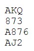 Du hører makker åpne med 1hj. Du melder 2kl eller 2ru og får høre at makker har fire ruter. Nå var det mange som satt ruteren som trumf, men det er rett og slett feil. Det er en feil forestilling av kontrakter alltid spilles bedre på 4-4 enn 5-3. Det er kun når det kan stjeles på den ene hånda at 4-4 er bedre, forutsatt at det ikke kan stjele den korte trumfhånda i 5-3. Her ser du at de svarte fargene er tapsfrie og et eventuelt avkast vil være makker femte hjerter. I hjerterkontrakt derimot vil det kun være et avkast av den fjerde ruteren. Makker kan også ha 6-4 i rødt og da skal i alle fall hjerteren være trumf.