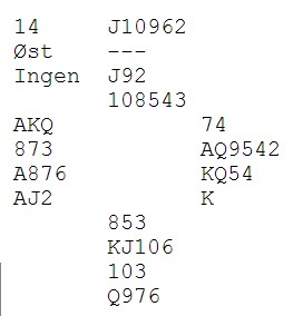 TL lot Hoftaniska i nord (på grunn av manglende alert) i praksis gjøre om sin melding til dobler eller 2kl for å vise noe annet enn 2hj gjorde. Det jeg ikke kan forstå, er at TL ikke da ser at øst får meldt ruterfargen sin på 2-trinnet. Det skjedde på mange bord, noe som igjen første til at vest hoppet i ruter med et ess,fire trumf og kløverkongen. ØV vil havne i ruterkontrakt på et eller annet nivå,sannsynligvis i utgang. Reglene kan ikke være slik at den ene siden kan få gjort om meldinger, mens den andre siden må sitte med bind for øynene og legge på grønne lapper?