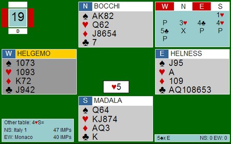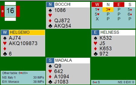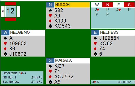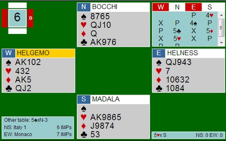 Augustin Madala er aggressiv i første hånd med sin 6-5 hånd og starter med 4hj. Ser du på mange slike fordelingsspill vil du oppdage at italienerne ofte er tidlig på banen med aggressive åpninger. Om det er riktig i det lange løp, har jeg ingen statistikk på. Denne gangen ble de i alle fall rett når Bocchi var med til 5-trinnet. Tor og Geir hadde havnet i en kravpass-posisjon og "måtte" doble 5hj. Det er sikkert mulig å spille bort den kontrakten, men når ruteren satt greit ble det elleve stikk. Uten trumf ut tror jeg det er mulig å vinne tolv stikk faktisk.