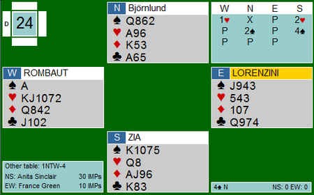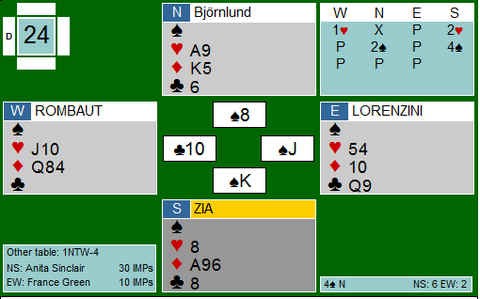 Det er svensken Fredrik Bjørnlund som er i førersetet og i ett spill henter han fram det ene coupet etter det andre. I tillegg benyttet han seg av informasjonen vest sin åpning ga. Hold deg fast!!