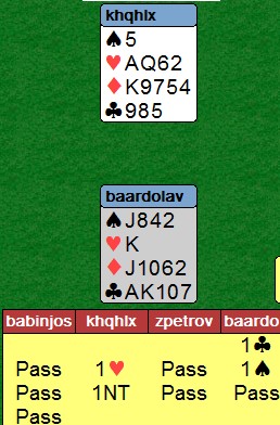 Baard Olav kommer i den sammen kontrakten som jeg tipper alle som åpner med en "moderne 1kl" gjør. Nord har ingen anelse hva slags fordeling makker har. Han har fra to til fire kløver og det samme i ruter.  Motparten tar normalt fem sparstikk og ruter ess. Bommer du ruteren går du beit i 1NT. Går ruterkappen vinner du normalt 1NT, men da er utgang i ruter nesten til å slenge i veggen. Uansett turneringsform skal du i alle fall spille med ruter som trumf på et eller annet nivå.