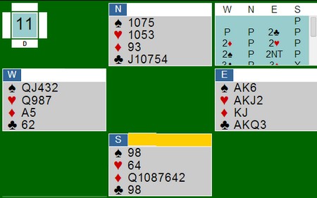 når jeg som makker til den sterke hånda har spar og ruter i en positiv hånd. Du må ikke komme og fortelle med at du har noe bedre enn dette når du skal melde slike hender.
