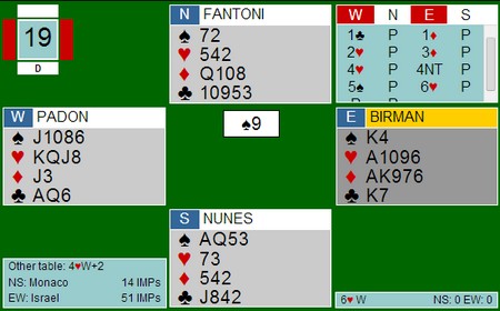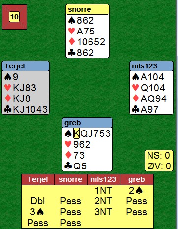 Jan Tore åpnet med 2kl og jeg meldte naturlig 3ru. 3ru viser en fin farge, enten HHxxx eller seks kort. Ulempen var at ruterkontrakt må spilles fra nord og ikke hos han som har honnører å beskytte. Jan Tore var flink og meldte 6NT, men vi hadde nesten fortjent at kløveren satt 4-1.