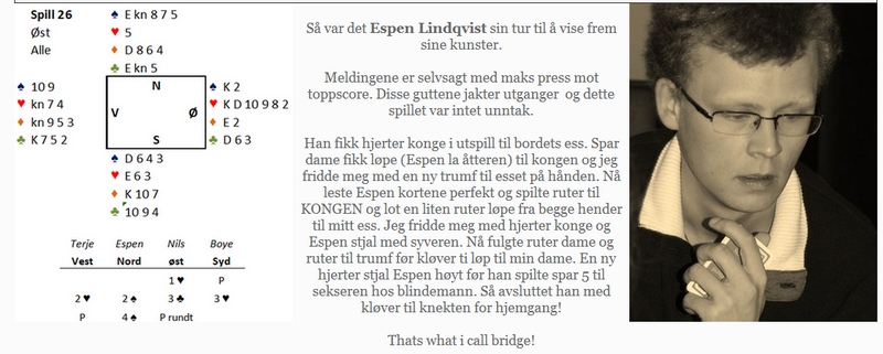 Til slutt vil jeg bare føye til at det ikke ligger noe personlig motsetningsforhold mellom Jan Aasen og meg. Vi kjenner knapt hverandre, men jeg har respekt for den innsatsen han over en årrekke har lagt inn for bridgen i Norge.