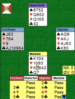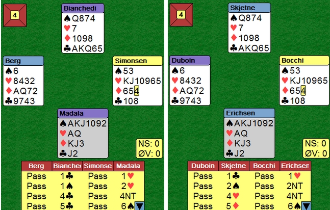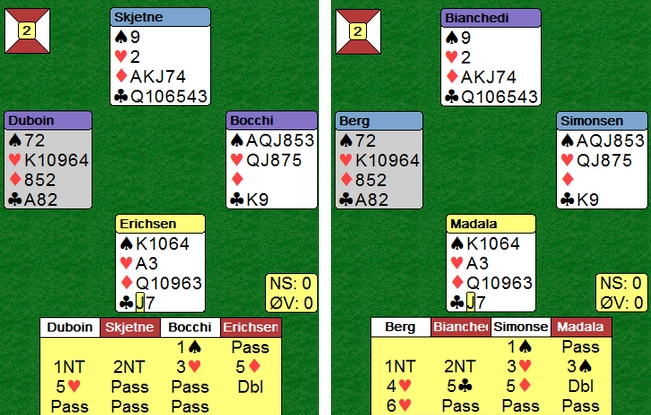 Her var det utspillerne like gode. Både Steffen og Bocchi fant det drepende ruterutspillet. Denne gangen var det uheldig å spille overføring etter 1kl-åpning, for fra nord er 6sp ubeitelig,