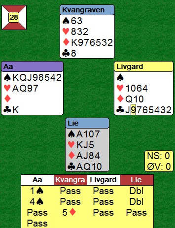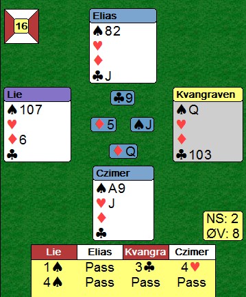 Kløver stakk Nils helt korrekt med esset og kongen kom deisende på. Så kløver ti til stjeling, ruter konge og ruter til esset. Kløver dame, bort med en spar i bordet. Spar ess og spar til stjeling, ruter til hånda og siste spar til stjeling.