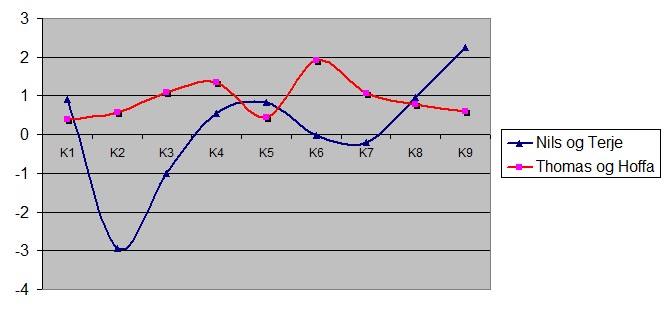 Det er rett og slett imponerende av Thomas og Thor Erik å score pluss i alle rundene, sammenlignet med snittet i salen. Det vitner om solid spilling. Nils og Terje hadde en marerittrunde (Kamp 2), men etter det har det vært tett og fint derfra også. Nils og Terje hadde nesten 0,4 i snitt totalt, mens Thomas og Hoffa scoret litt under 1 IMP i snitt. Sterkt.