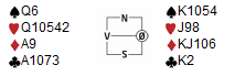 I denne sekvensen har Terje veldig ofte singel hjerter og da ser Nils at det er fint med fem tasser der. Det er bare å bytte Terje sin hjerterkonge til ruter og gi han singel hjerter i stedet for singel kløver, og 4sp er plutselig et spillbart prosjekt.