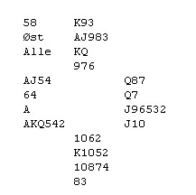 Ved vårt bord gikk meldingsforløpet p-p-2klø*-? Vi har veldig godt sys i posisjonen hvor makker svarer 2ru på OD med 0-7, der med tenkte jeg at på alle andre svar var jeg i utgang. Valgte derfor å doble i stedet for den mer normale 2NT på mine 16 gode HP, Så når det da gikk x-p-2ru-p, måtte jeg melde 2hj, som kun viser 4kort hj og en normal OD, makker kunne/burde(?) Kanskje meldt 3ru første gangen nå ville 3ru bare vise lengde og forsøk på å bedre kontrakten. Vi kunne begge valgt å melde annerledes ved første anledning i sum ble forsiktigheten behørig straffet med 10 imp ut! Så som Tor og Geir sier NT er NT og det å gjøre Bridgen enkel er gode regler!