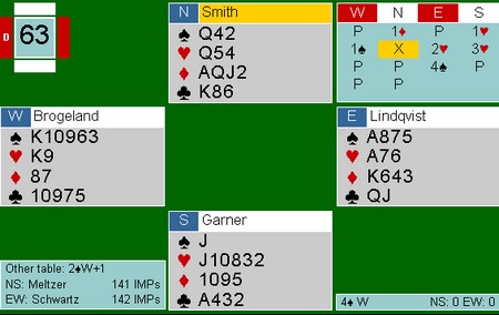 Som sagt så gjort,. men pasienten døde. Kløver 9 tolka Boye som at jeg hadde 98 i kløver og spilte fargen rundt til åtteren til spillefører. Påtrøkk de luxe og en elendig score for -110.