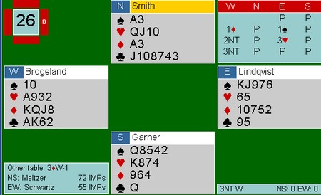 Syd åpnet med 1hj, Boye i vest meldte inn 1sp (?), 1NT fra nord, 2hj i syd og pass rundt. Kløver fire ut til esset mitt i øst.