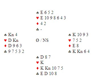 Jeg tar for den nest siste hjertern og øst er trumfskviset. Kaster han kløverknekten eller ruteresset, går det spar til damen og avkast av en spar på det godspilte kortet. Kaster han en spar, spiller jeg spar til damen og stjeler et minorkort. Spartassen gir det siste!