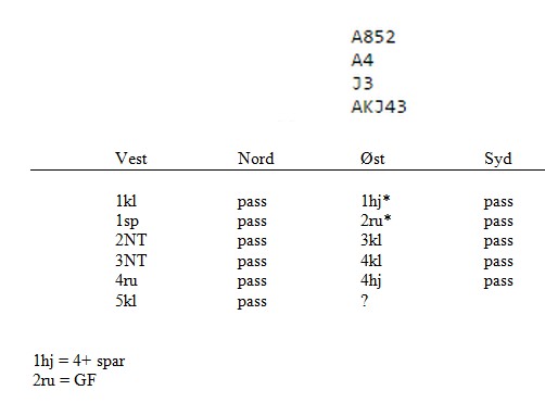 Poenget er at øst vet at makker har akkurat tre spar og ikke kontroll i fargen. Uten spardamen, vil det alltid være beit. Selv med spardamen hos makker vil 6kl være avhengig av sparkongen rett plassert. Det trenger heller ikke være nok, fordi det er ingen garanti for at de røde fargene er uten taper. Du vet også at den trettende sparen ikke vil kunne brukes til noe selv om makker har damen, kongen sitter rett og fargen 3-3. I mine øyne en opplagt pass på 5kl.