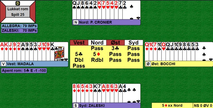 Da Lise Klev (N)- Ingebjørg Berger (S) måtte Hilmar Frønningen (Ø)- Per Even Melbye (V) ble det dramatikk. Ingebjørg åpnet med 1 spar (bare 9 HP men flott 2- seter), Per Even gikk innpå med 2 hjerter og Lise meldte 3 kløver. Hilmar hadde jo den aller sterkeste hånden og hoppet til 4 hjerter men S som nå visste at kløverfargen var god sidefarge/ hjelpetrumf satset på at 4 spar var spillbar. Pass rundt til Ø som ikke var enig, men dobling ble kostbart, for da tok S ut i makkers farge i stedet.