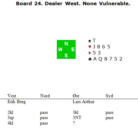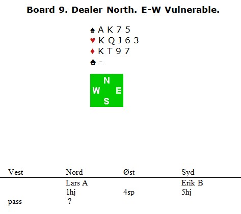 Lars Arthur kjente ikke meldingsforløpet, men nord hadde i alle fall åpnet med 1sp, syd hadde støttet og vest meldt kløver. Over 4sp stampa vest i 5kl og pressa nord til 5sp.