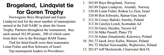 Det var Tor Olsen(V) som meldte 3 hjerter og Veronica Pettersen (Ø) doblet mitt «sluttforslag»- men det bare akselererte budserien. Helgesen likte ikke renons i trumfstøtte og introduserte 5 ruter med sin laangge 7- korts sidefarge. Tor gjenmeldte 5 hjerter men med så fin trumfstøtte i ruter måtte jeg jo være med. 6 ruter var opplagt, men ikke slutt for det. Ø meldte 6 hjerter men etter pass rundt valgte jeg å tro på undere og at 7 ruter var spillbar. Ø sin dobling av 5 kløver og makkers kontante uttak kunne indikere at Ragnar også hadde renons å by på. V doblet og hjerter ut trodde jo Helgesen skulle bete direkte, men bordet kunne jo stjele, en runde trumf rensket den fargen og det var jo ingen problem med å godspille kløverfargen. +1630 ga topp, men 6 ruter doblet med overstikk som Gunnar Saxegaard- Jan Erik Olsen fikk var også supert, +1190. Mange ØV par fikk spille billige stampekontrakter i 6 hjerter, men ved ett bord gikk faktisk 6 hjerter udoblet hjem til + 980. Flemming Johnsen- Steinar Fugleneb sto for den prestasjonen.