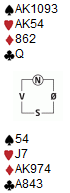 Åpning 1 ruter og da S ikke gikk innpå med 1 hjerter bød anledningen seg for oss. Tone meldte selvsagt 2 kløver (krav 2 over 1 brukes til minst 2 NT) og med gode toppkort valgte jeg å reversere med 2 hjerter selv om makker omtrent aldri vil ha 4- kort støtte der. Nå var S utmeldte, Tone vet om minst 5-4 fordeling og krevde med 4. farge, og på 2 spar kunne jeg bekrefte hold med bud 2 NT som også viser begrenset tillegg. Men med flotte kort og tilpasning kunne nå V melde 4 NT, tradisjonell 4-ess, og da jeg viste mitt ene ble det stopp i 6 ruter. Alt sto på at kl K satt gunstig, og S hadde majestetxen. Vi var eneste par i lilleslem som har 50% vinnersjanse. Men melder S innpå 1 hjerter er jo vi også automatisk i sluttkontrakt 3 NT. V overmelder og jeg svarer 3 NT.