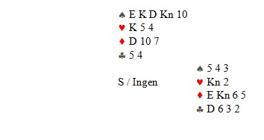 Jeg refererer: "Makker spilte ut ruter 10 til mitt ess. Så hjerter to tilbake til knekten og makker tok for esset. Så visst han ikke hva han skulle gjøre, fordi spillefører kunne da ha 5-3-5-0 og kløveresset var katastrofe. Han spilte en hjerter til, men da føyk dette hjem. Ut med trumfen og ruter til nieren. Alle bordets kløver forsvant. Min feil, fordi jeg skulle spilt hjerter fem tilbake og fulgt på med toeren for å vise fire stykker!"
