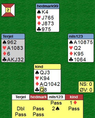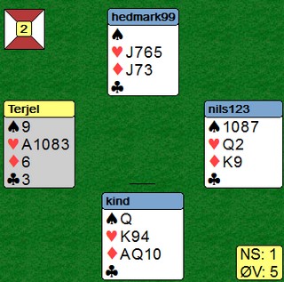 Festus spilte ut en liten hjerter og kontrakten var ubetelig. Jeg var nok litt skuffet, da jeg satt med følgende kort:: AKD1073 - 83 - 109 - K76.