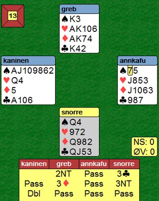 Trine og Hilda halte i land sin andre seier i årets klubbmesterskap. De spilte nok fornuftig bridge; de viftet ihvertfall energisk med siste nummer av Arbeidets Rett i hånda hver gang de havnet i en utgang, og proklamerte at 12 stikk ikke alltid betød lilleslem. Ikke uventet ble Frank og undertegnede satt i galgen i samme artikkel etter å ha funnet en opplagt slem som kun står på trumfen 3-3 imot, noe som skjer "relativt ofte" (sitat Frank).