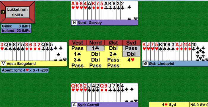 Espen vet at 4hj er beit, men kan ikke doble fordi makker vil nesten alltid ta ut. Fem udobla beiter når Boye ikke kunne holde oppe i siste hånd. Likevel 3 IMP inn.Simon Gillis åpnet med 2hj på det andre bordet og fikk spille det. De samme fem stikkene, men "bare" tre beit.