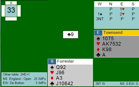 Men så til spillet til Arild. Nord har vært inne med hjertermelding, men Arild i Vest skulle spille hjem 3 Spar med disse korta:
