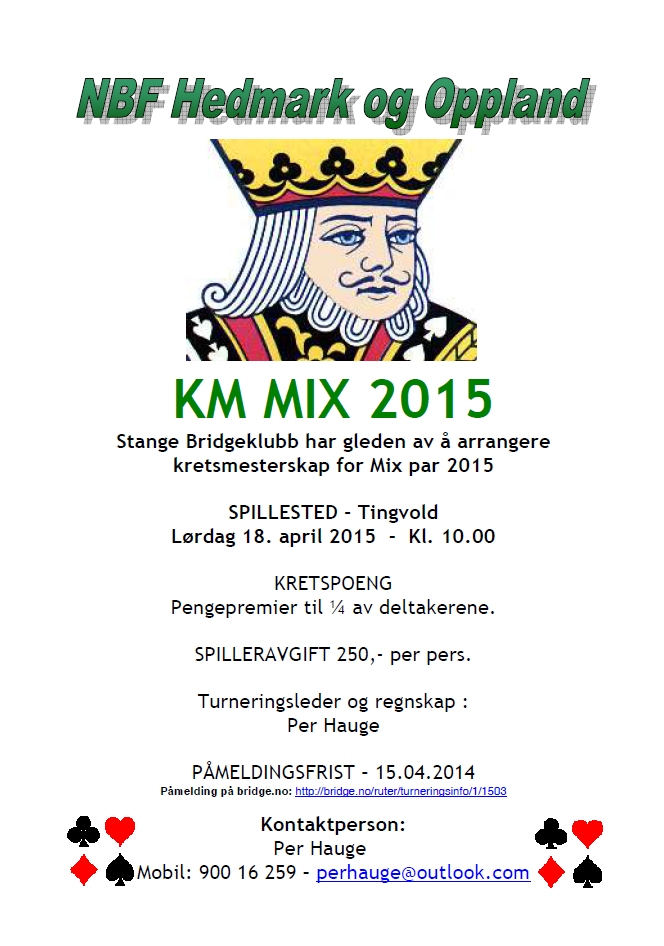 Vi bør vel ha en sjanse i alle fall, men det er mange gode lag og ingen ting kan forskutteres. Jeg spiller på lag med to jeg har blitt norgesmester med og en jeg fikk sølv med nylig Jeg kunne ikke hatt det bedre. I tillegg er de utrolig hyggelige mennesker og mine gode venner. Geir Brekka som Norges tolvte beste! LOL, Det får være dine ord, Snorre. Han er en fantastisk spiller og en fantastisk makker som evner å få det beste ut av de han spiller med. Han kan vinne med alle, særlig med Ann Karin. Hun er en glimrende bridgespiller og har et vanvittig vinnerinstinkt.