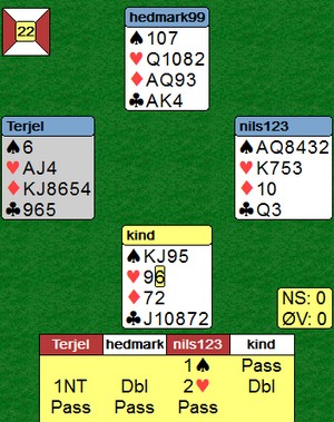 Etter tre av fire kvelder i klubbmesterskapet ligger veteranene Steinar N og Tore fortsatt i teten . De ledet etter to kvelder og beholder fortsatt teten med vel 2 % poengs margin på Arne og Bjørn som fortsatt beholder andreplassen. Lederparene scoret begge litt over middels denne kvelden og det var foreløbig nok til å holde på sine plasseringer. Størst endring i tetbildet var det på tredjeplasen dit John Roar og Bjarne ( denne gang med Cato som reserve ) avanserte fra 5te til 3dje og bronseplass.