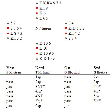 Han fikk sparess og spardame ut i 3NT. Så seks ganger kløver og øst sliter. Gaute Ubostad blanka både hjerteresset og ruter kongen, men Tom leste rett og spilte ruter til esset. Neste gang rister du litt mindre på hodet i avkast, Gaute :-)