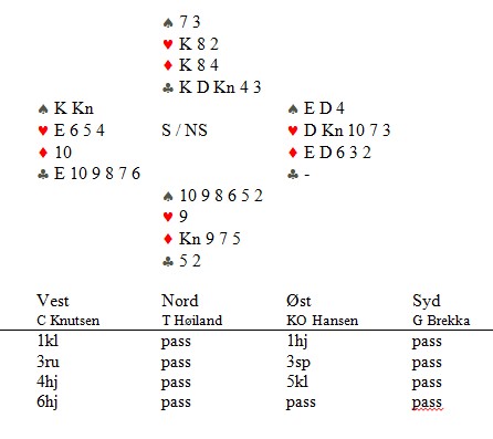 Ikke verdens verste slem å melde. Med hjerter ut står dette og faller på kløveren. Gaute Ubostad kasta tidlig en kløver fra tre små og da ble det easy-peacy for Tom.